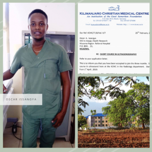 Ons bestuurslid Saja Erens is momenteel in Tanzania, waar zij onze projecten bezoekt. In Moshi ontmoette zij Oscar Issangya. Saja en Oscar ondertekenden het sponsorcontract, waarmee Oscar officieel de eerste deelnemer is aan ons project ‘Adopteer een echoscopist!’. Mede dankzij jullie steun kon hij op 1 april beginnen aan de echografie-cursus in het KCMC Hospital. Hij heeft onderdak gevonden in het nieuwe hostel naast het ziekenhuis. De eerste cursusweek bestond vooral uit observeren en de basisprincipes van de echografie leren kennen.